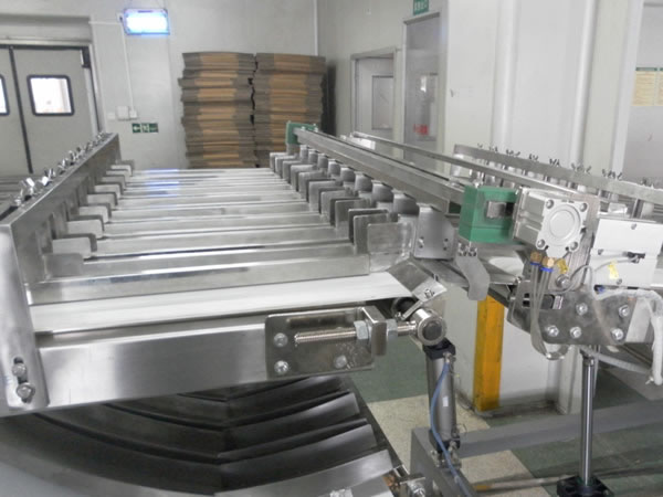 El dispositivo de desviación automática ejerce una función de amortiguación. Si hay galletas pegadas en la máquina sandwichadora o empaquetadora automática, o estas dos máquinas se detienen, el dispositivo de conmutación cambia el rumbo de las galletas para desviarlas del alimentador vibratorio y enviarlas a otras cintas transportadoras para almacenarlas temporalmente.