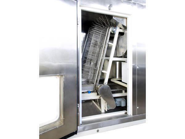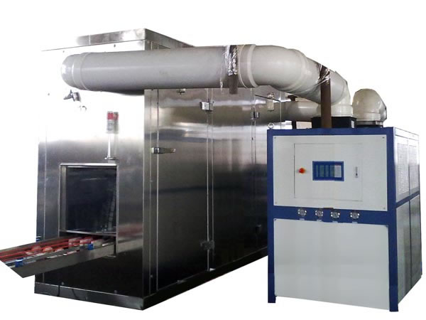 Después de la untadora de crema, las galletas tipo wafer pasan al enfriador vertical donde se enfrían rápidamente y adquieren la forma final y textura crujiente. Este equipo de procesamiento de comida incorpora un sistema de refrigeración por aire o agua. La temperatura de trabajo mínima de este enfriador de oblea es de -5ºC y la temperatura estándar es de 8℃-12℃.